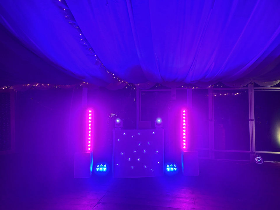 Make your day perfect by creating the right mood and vibe for your wedding or event. We can create the mood for your event with room up-lighting offering a choice of colours or effects. From a set static colour to a rainbow fade or colour chases. If hired with a DJ set we can set the lights to activate to the sound of the music creating the perfect party environment.